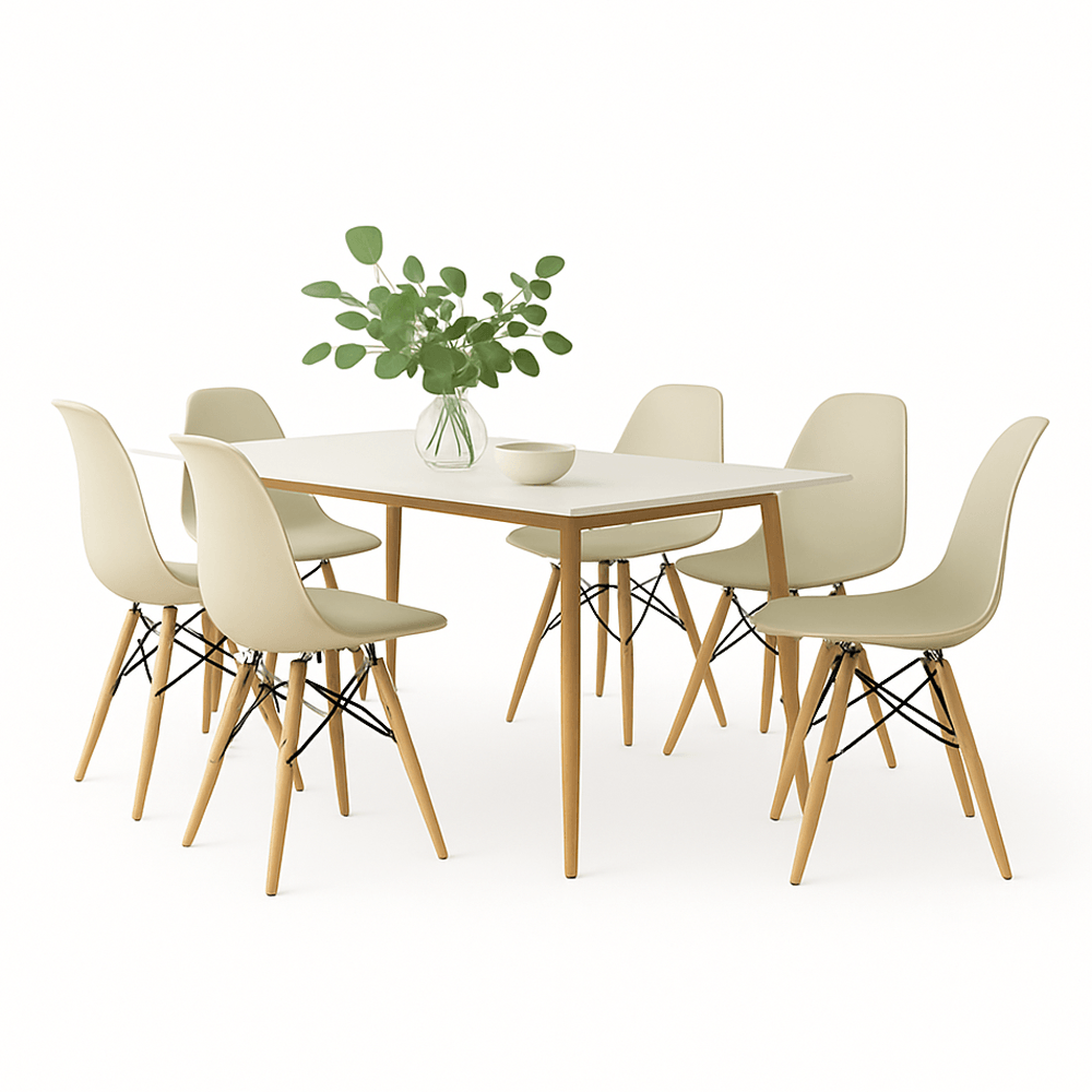 Conjunto Mesa Tianjin Diamante 140cm com 6 Cadeiras de Plástico Eiffel - Branco/Marfim