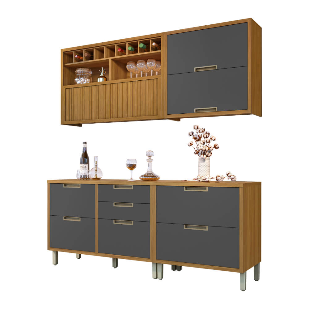 Cozinha modulada Nesher Imperatriz 4 peças com Nicho Adega e Portas basculante - Freijó/Grafite