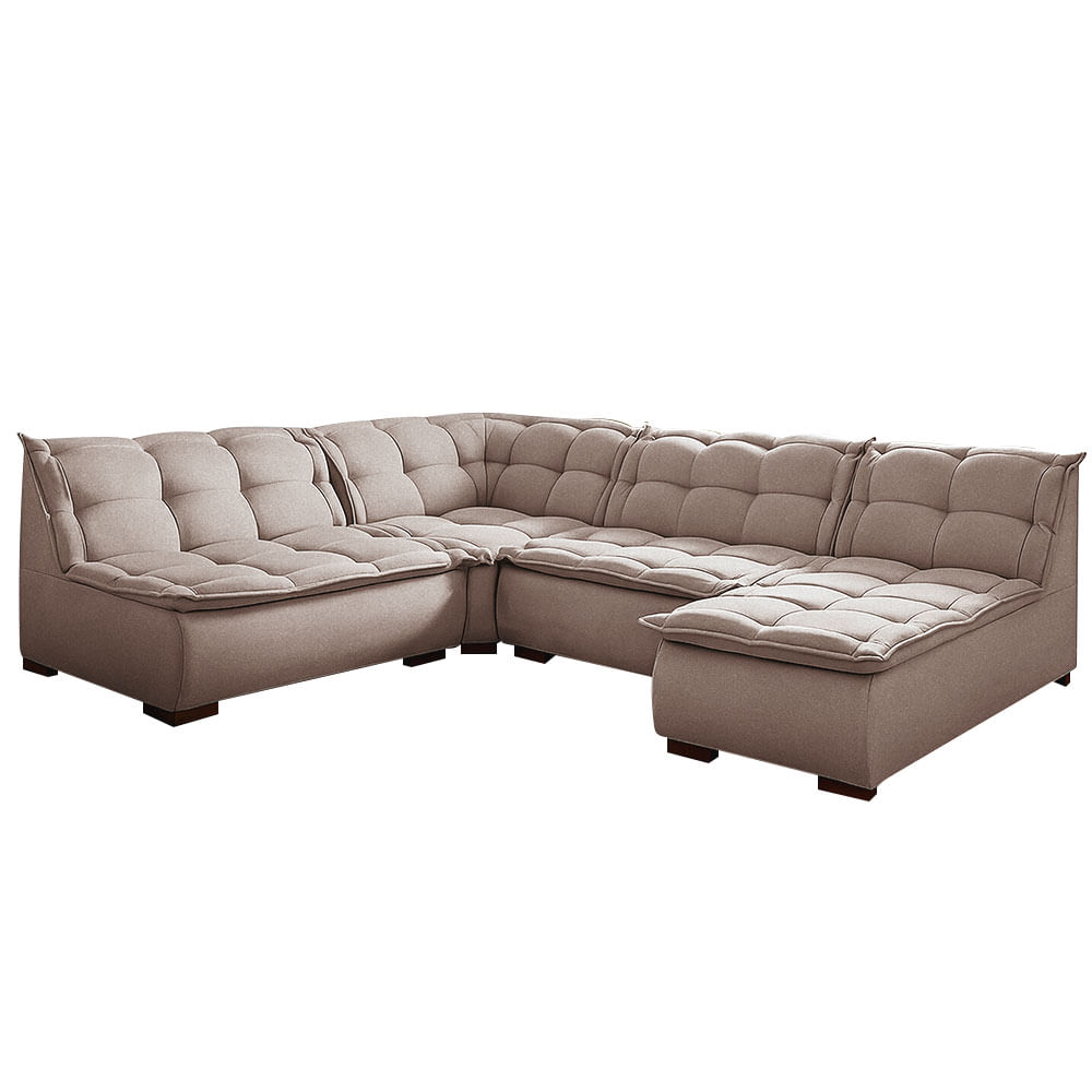 Com pés em madeira, ele une o charme do design natural à resistência estrutural, criando um visual equilibrado e sofisticado. O destaque fica por conta da chaise, que convida ao relaxamento e amplia o espaço de acomodação, perfeita para receber amigos ou curtir momentos de lazer com a família.